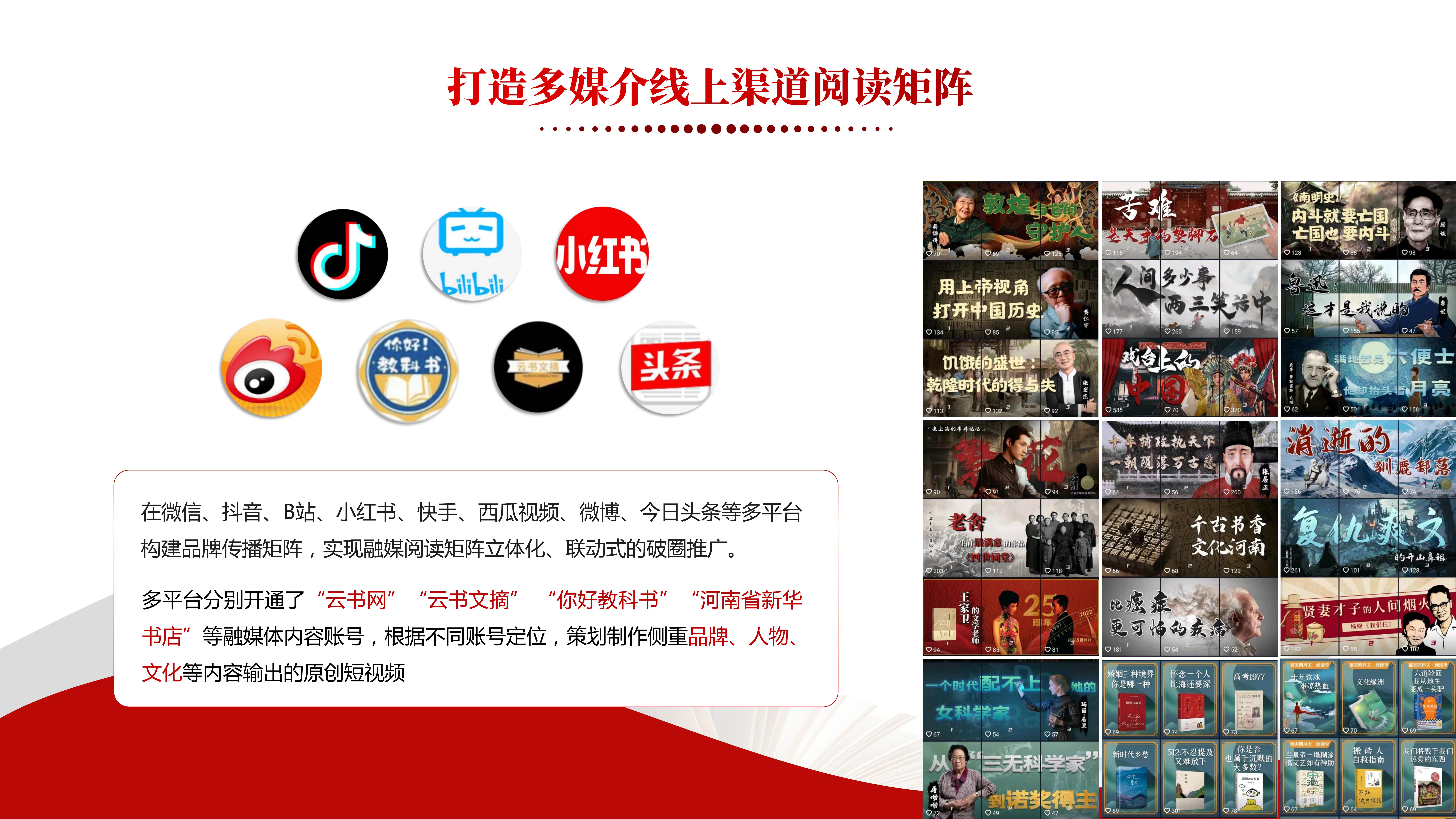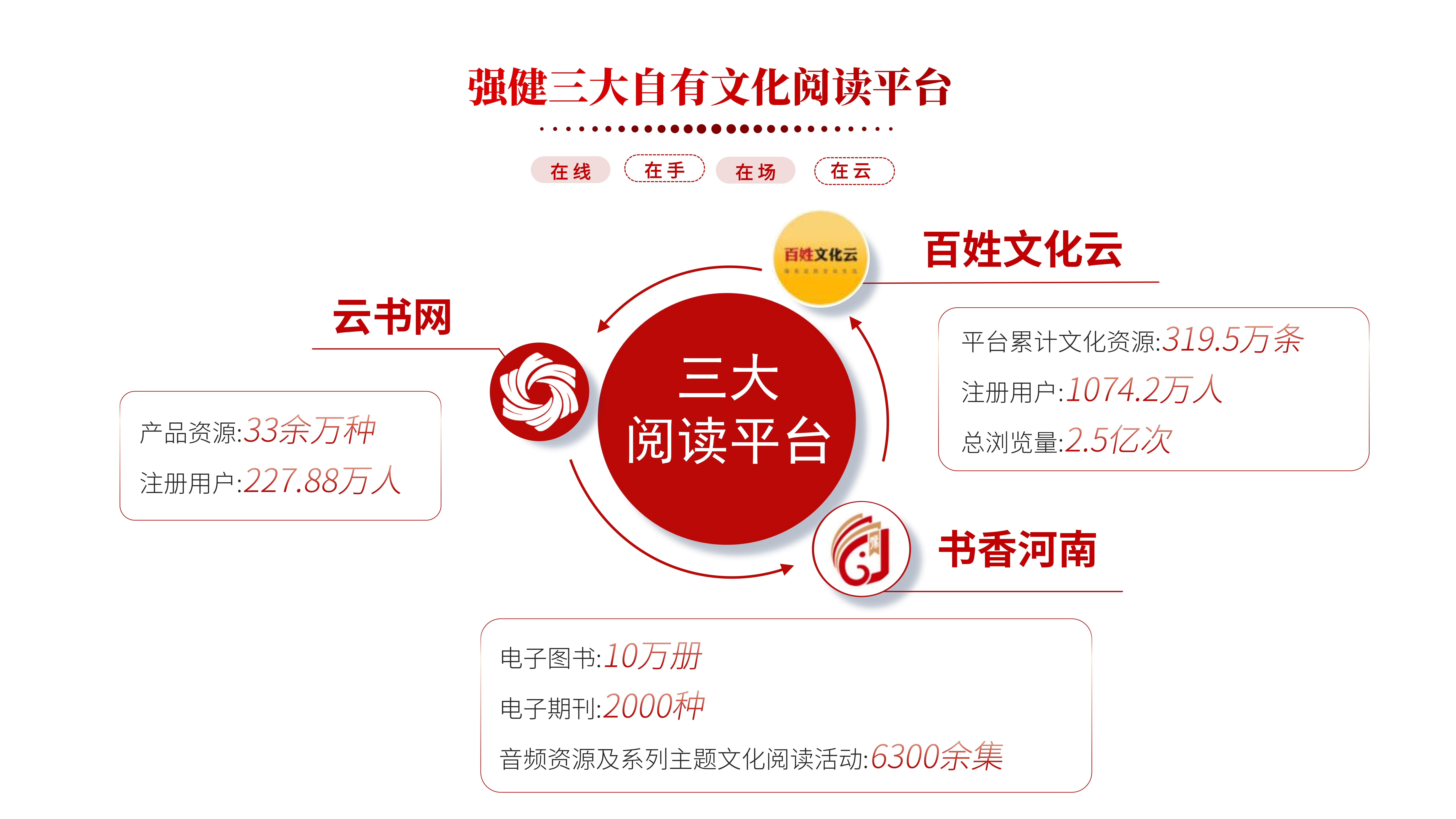河南省新華書店緊貼人民群眾線上需求,主動順應(yīng)數(shù)字經(jīng)濟發(fā)展方向與新時期閱讀潮流,堅持以互聯(lián)網(wǎng)思維構(gòu)建融媒閱讀傳播矩陣,布局搭建了云書網(wǎng)、百姓文化云、書香河南公共文化平臺,以及各類閱讀社群、直播矩陣、短視頻等融媒矩陣平臺,形成了“在線、在手、在場、在云”閱讀體系,持續(xù)完善構(gòu)建線上線下融合互動、立體覆蓋的文化服務(wù)供給體系,傾力為人民群眾提供多端觸達、全域全景的線上閱讀服務(wù)。